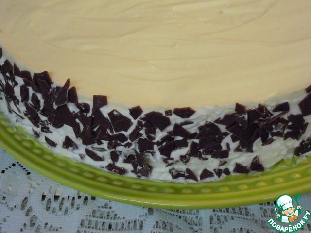 Взбейте 300мл сливок. Обмажьте края торта взбитыми сливками и обсыпьте их шоколадной посыпкой или тертым шоколадом.