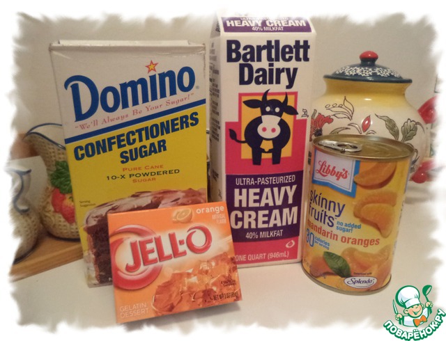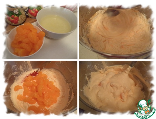 С мандаринок слить сок. 500 мл сливок взбить до состояния крема, добавить 3 ст л сахарной пудры. Продолжая взбивать влить разведённое желе. Получается очень красивый нежно-оранжевый цвет. Добавить мандаринки и аккуратно перемешать, стараясь их не раздавить.