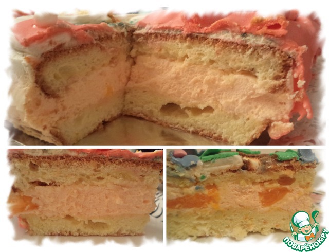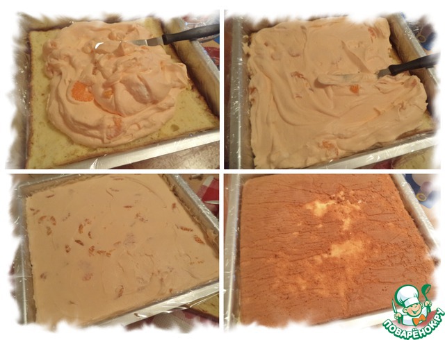 Форму в которой выпекался бисквит выстелить пищевой плёнкой, положить один корж и пропитать его сиропом от мандаринок или апельсиновым соком (который остался от приготовления бисквита). Сверху выложить весь крем и разровнять его по всей поверхности. Пропитать второй корж сиропом (или соком) и выложить его на крем. Отправить торт в холодильник на несколько часов или на ночь.
