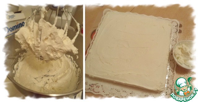Взбить 300 мл сливок с 2 ст л сахарной пудры до состояния крема. Отложить 2 ст. л. крема в отдельную посуду. Остальным кремом покрыть торт со всех сторон. Добиваться идеально гладкой поверхности не надо.