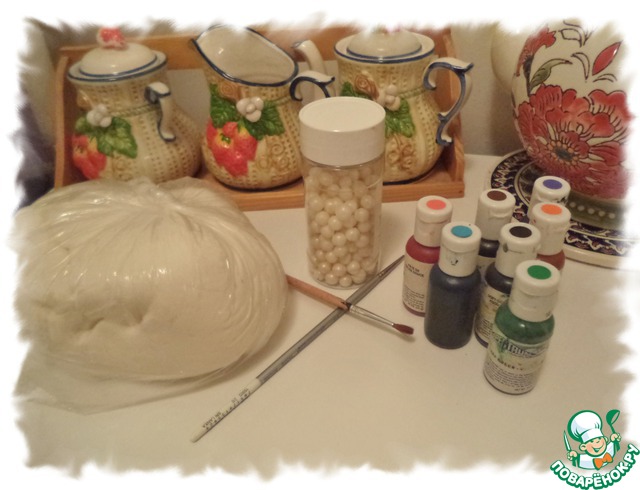 Теперь приступаем к декорированию. Для этого нам понадобится мастика, пищевые красители, конфетки жемчужинки и кисточки, одна из которых должна быть очень тоненькой.