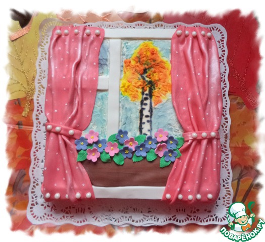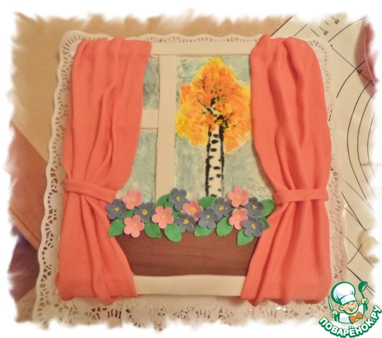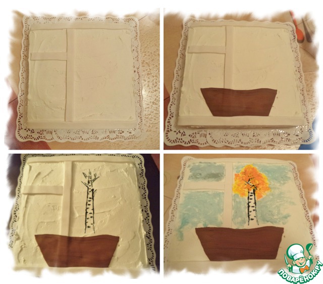 Раскатываем белую мастику толщиной примерно 3-5 мм и вырезаем из неё три полоски для рамы окна шириной примерно 2 см. Если полоски по длине не дойдут до углов торта, это не страшно, этого видно не будет.