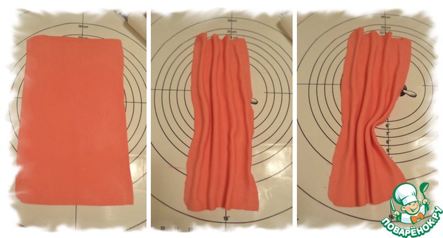 Раскатываем красную мастику толщиной 3-5 мм и вырезаем прямоугольник примерно шириной в половиму торта и длиной сантиметра на 3 длиннее чем длина торта.