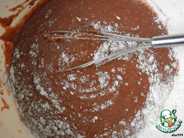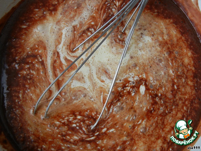 Добавить в шоколадную массу желтки, взбитые со сметаной, и хорошо перемешать.