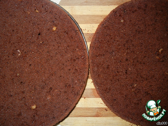Остывший бисквит разрезать на три коржа. 1 и 2 коржи хорошо промазать кремом и сложить.