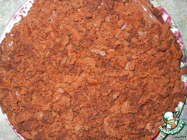 Накрыть третьим коржом и поставить на холод на минут 30. У меня третий корж разломался, я его просто раскрошила.