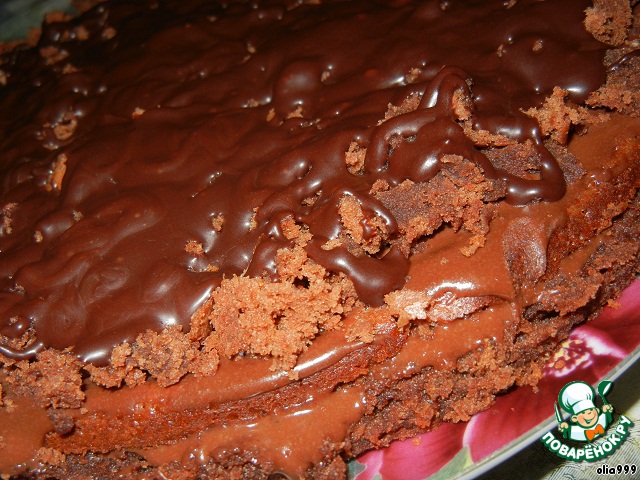 Торт вынуть из холодильника и полить большей частью шоколада.
