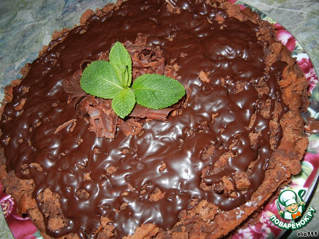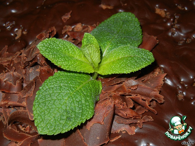 Застывшую шоколадную массу вынуть из холодильника и острым ножом отделить стружку. Получившуюся шоколадную стружку высыпать в центр тортика и украсить листиками мяты (по желанию).