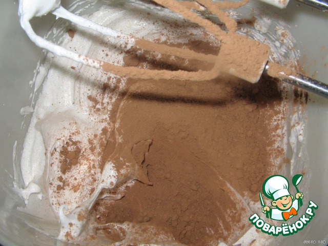 Крем: Белки взбиваем с сахаром в крепкую пену, добавляем какао.