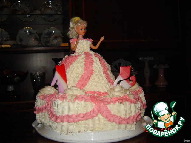 Барби вставила в верхний бисквит. А бисквиту придала форму платья. Вот и всe, и начала украшать торт. По-моему, я всe понятно написала.