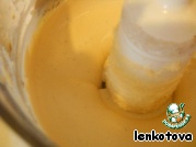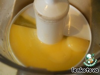 Яйца разделить на желтки и белки, желтки взбить с 2 ст. ложками горячей воды и 120г сахара, добавить муку, взбить.