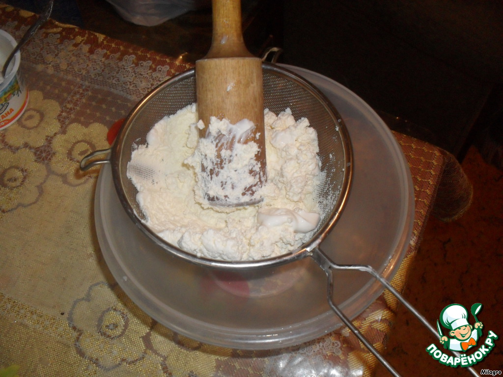 Протрем через сито творог, добавим сметану, ванилин, сахарную пудру.
