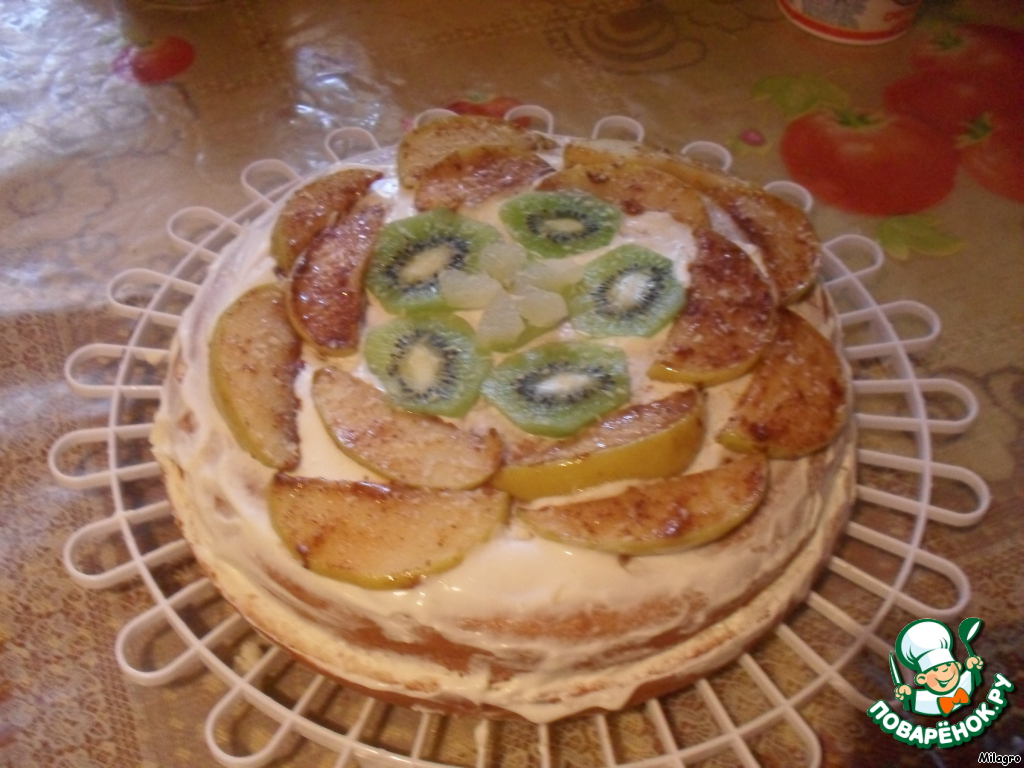 Верхушечку я смазала сметаной, а наверх выложила дольки яблок, которые обжарила с корицей и сахаром и украсила киви и консервированными грушками. Обсыпала слегка кокосовой стружкой.