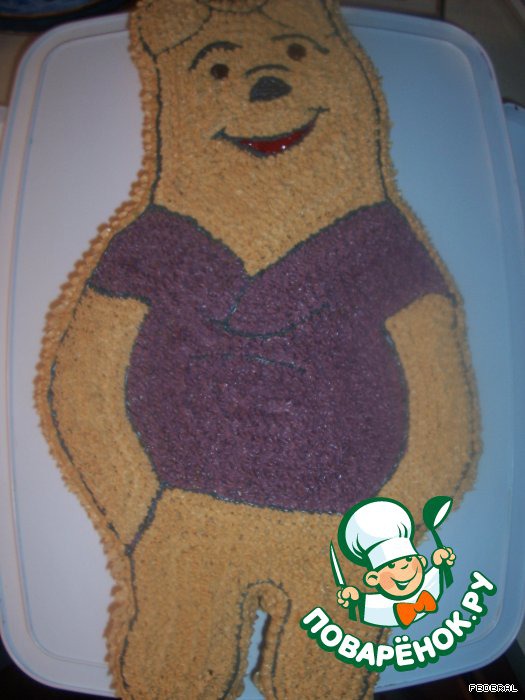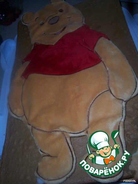 Из коржей вырезаем форму мишки, у меня был мишка с игрушек.
