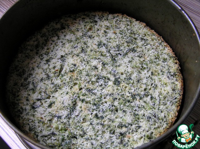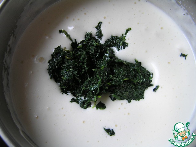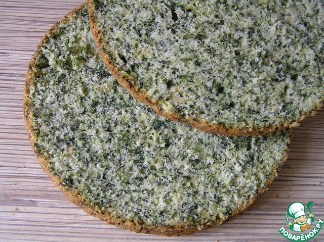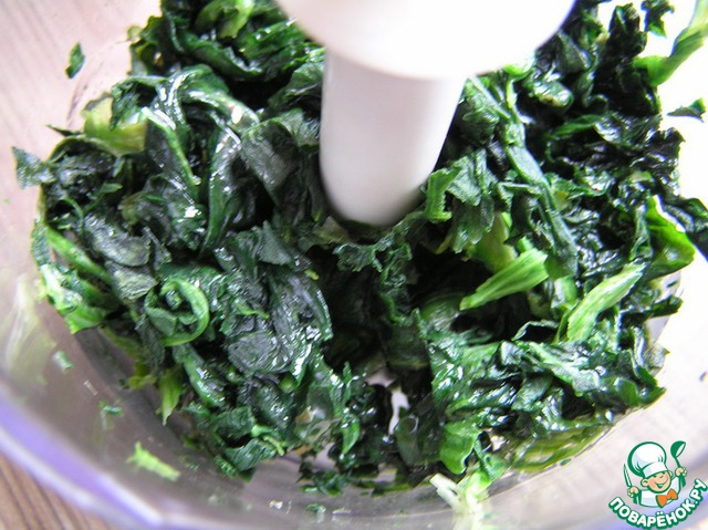 Приготовить бисквит. Шпинат разморозить (или промыть, если свежий), отжать (или обсушить), поместить в чашу блендера и измельчить.