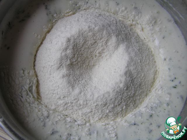 Всыпать муку с разрыхлителем и перемешать лопаточкой.