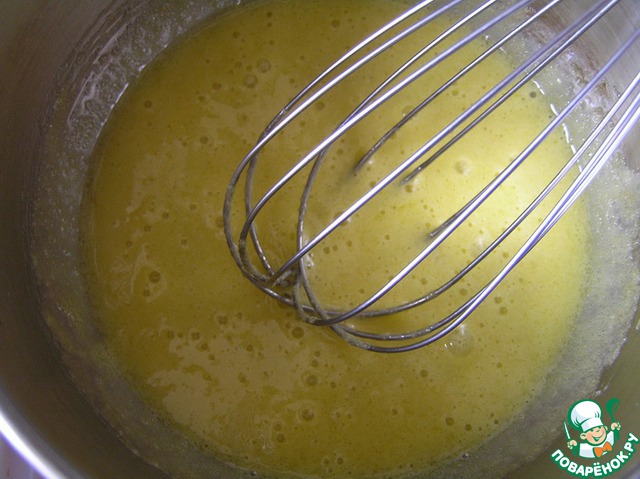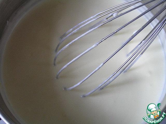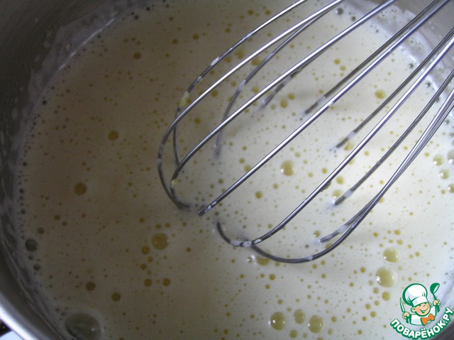 Молоко влить в яичную массу, перемешать, вылить все обратно в кастрюльку (для быстроты я использовала 2 кастрюльки и не переливала). Постоянно помешивая венчиком, снова довести массу до 85°. ***Этот крем очень нежный, главное — не переварить, поскольку при 86° желтки сворачиваются. Но если желтки у Вас все-таки сварились, то нужно процедить крем через сито.***