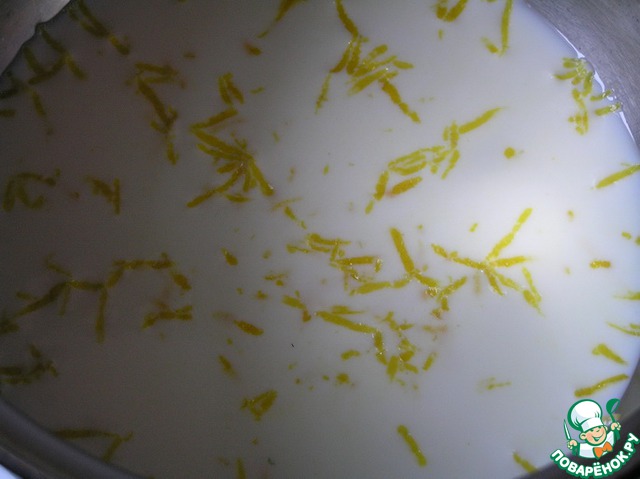 В молоко добавить цедру лимона, подогреть почти до кипения (если есть градусник, то до 85°, если нет, то когда от молока начнет подниматься пар).