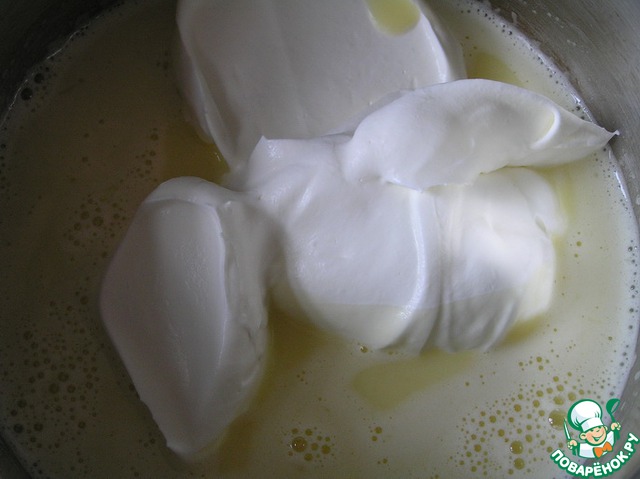 Охлажденные сливки взбить до устойчивых форм пик. Смешать взбитые сливки с остывшим до комнатной температуры баварским лимонным кремом.