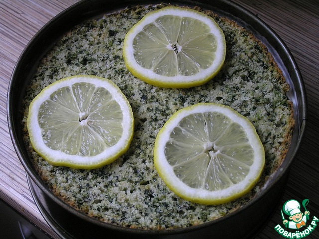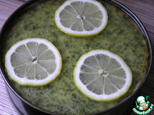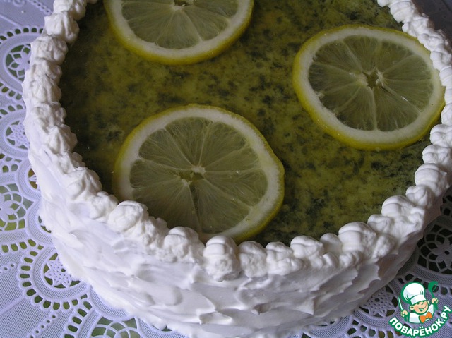 Из серединки лимона отрезать 3 кружка, выложить на верхний корж в форме.