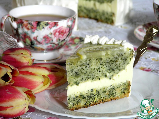 | В этом торте я хотела показать цвет первой весенней зелени. И, по-моему, шпинат неплохо с этим справился! ;) Торт получился с ярко выраженным лимонным вкусом: лимон присутствует как в баварском муссе, так и в желе. Угощайтесь! :) |
