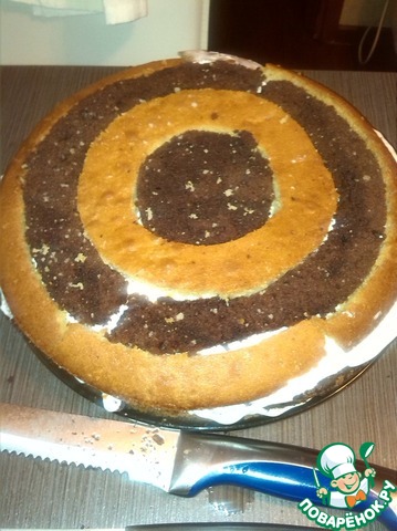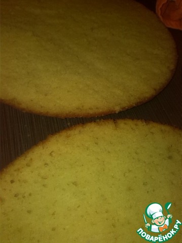 Далее ваша фантазия безгранична )) я сделала таким образом: сложила 2 разных коржа друг на друга и разрезала на круги.