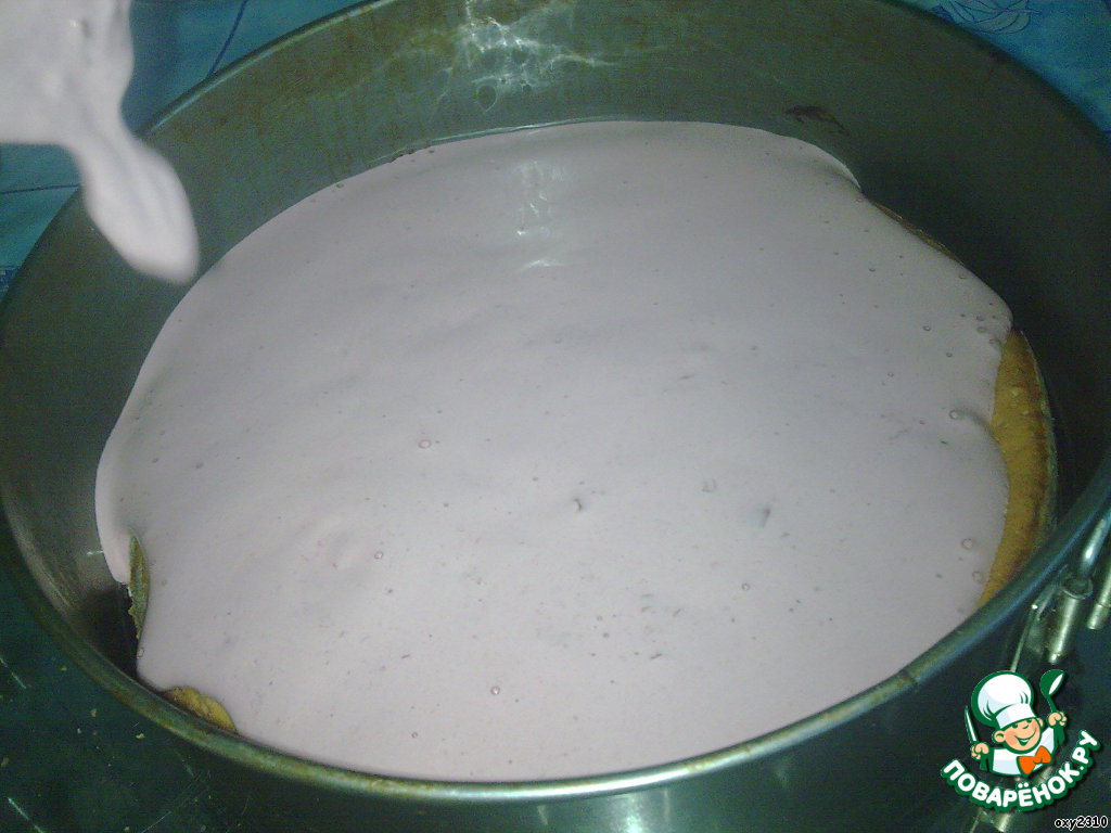 Ставим круг от съемной формы на корж и заливаем половину крем-суфле сверху, украшаем 100 г. вишни, и опять заливаем половину крем-суфле. Ставим в холодильник на 30 минут. Приятного аппетита!