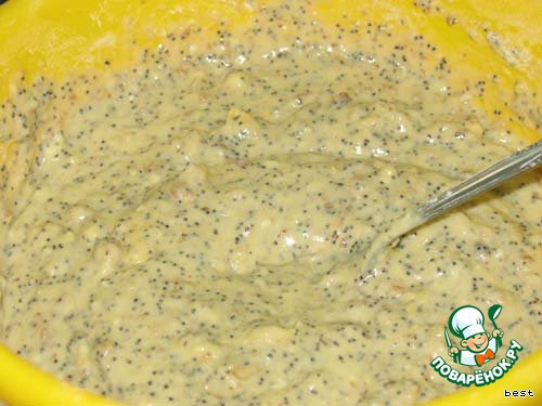 Яйца взбить с сахаром и ароматизатором, добавить растопленное масло и кефир. Вмешать муку с содой. В последнюю очередь вмешиваем мак и орехово-апельсиновую смесь.