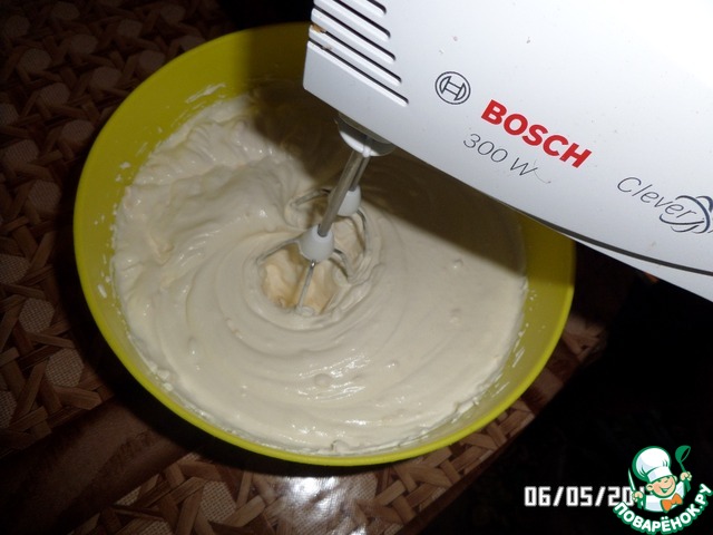 Делаю крем. Йогурт взбила с сахаром (т. к. он не очень сладкий был, а вообще тут на ваш вкус). Затем отдельно взбиваю сливки не до конца. Добавлю йогурт в сливки и взбиваю до готовности. Получается довольно густой крем.