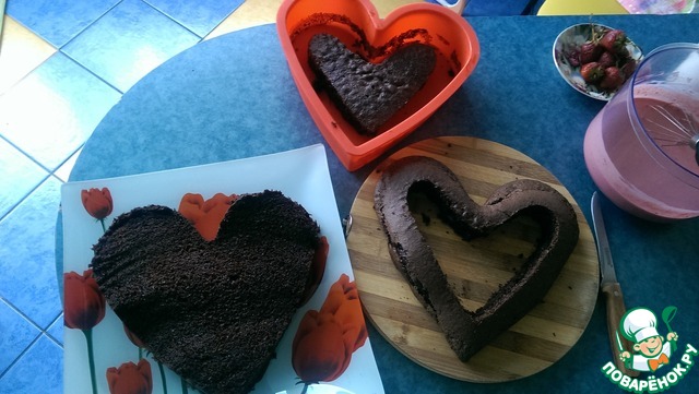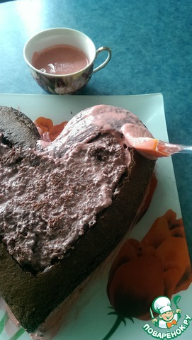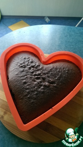 Готовый корж аккуратно разрежьте (если корж хорошо поднялся, разрежьте на 3 части, так торт будет сочнее)