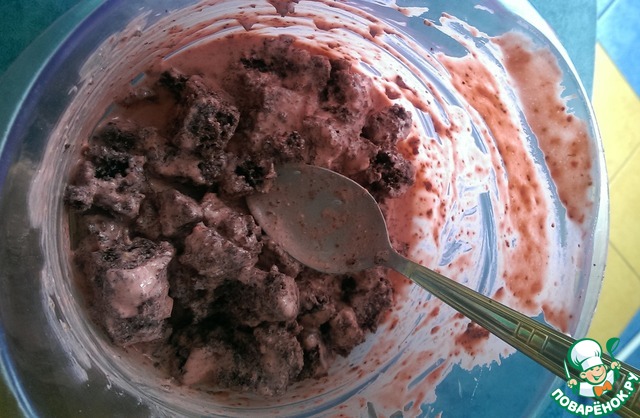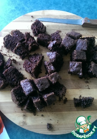 Смешайте порезанный корж с кремом (оставьте немного крема для того, чтобы смазать верхний корж)