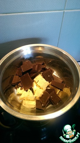 На водяной бане растопите шоколад и масло. Пока шоколад с маслом топится, отделите белки 2-х яиц от желтков. Поставьте белки в холодильник.