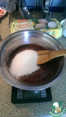 Снимите растопленный шоколад с огня и добавьте сахар. Хорошо перемешайте. Добавьте 4 яйца и 2 желтка