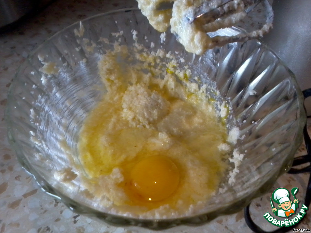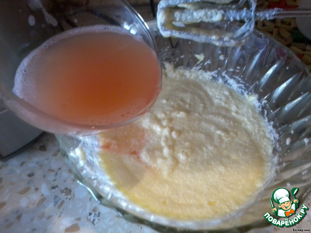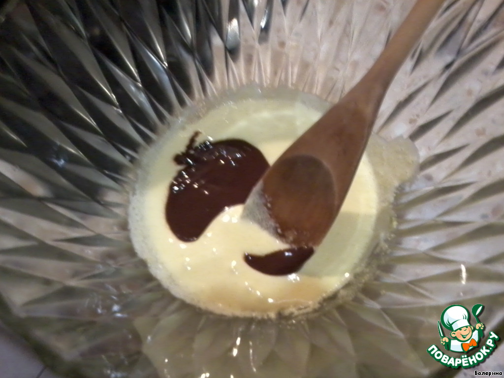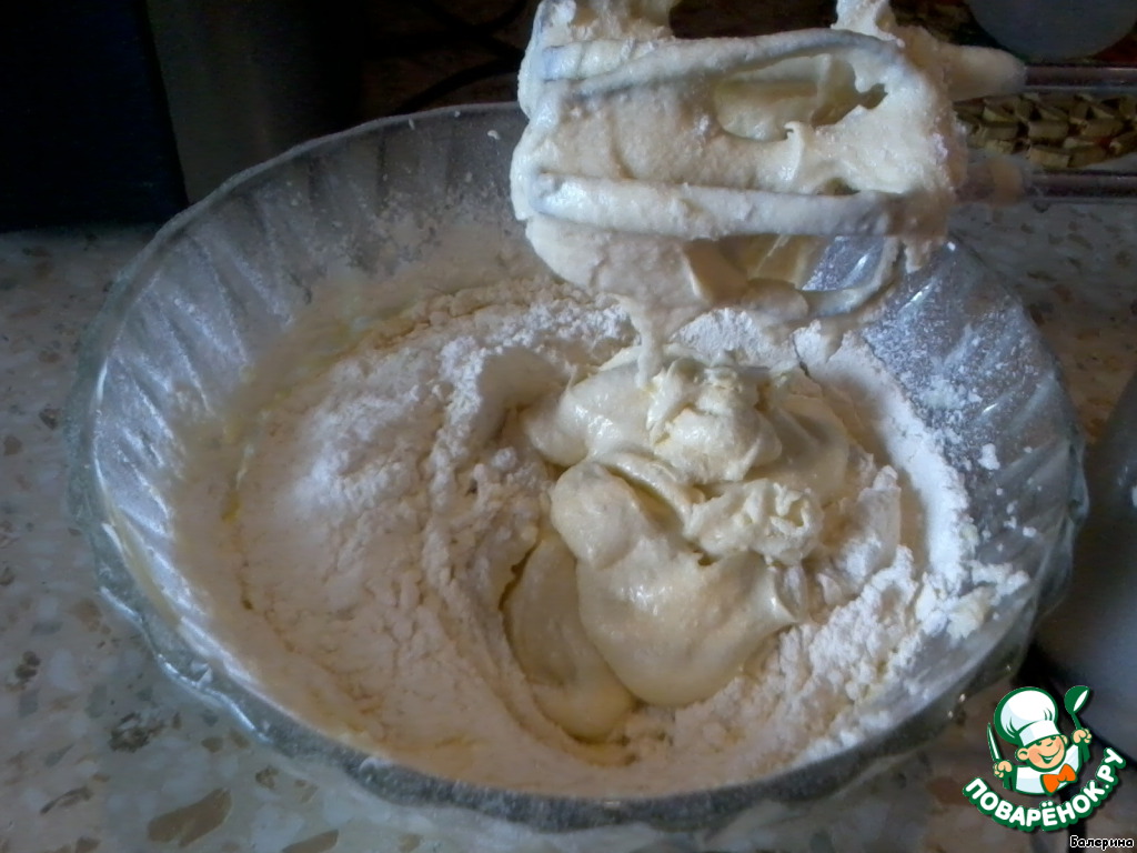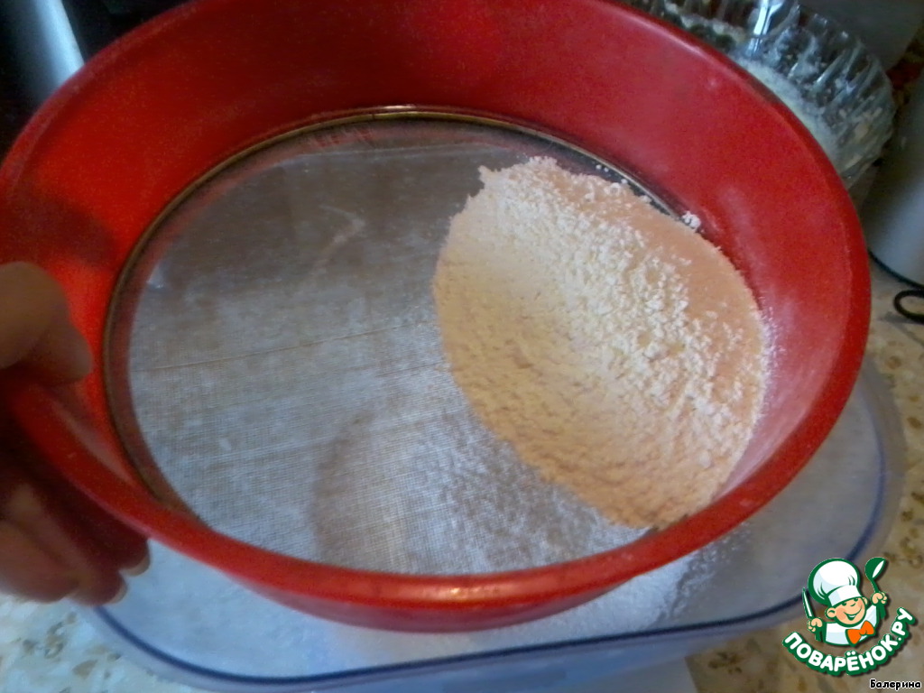 Муку 250 г и 2 ч. л. разрыхлителя просеять и ввести в яичную смесь.