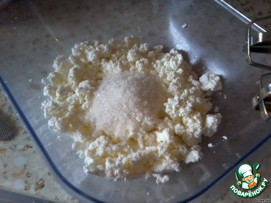 Творог, примерно 300-400 г (у меня было 360г), смешиваем с 50 г сахара и 2 ч.л. ванильного сахара. Здесь я воспользовалась блендером, чтобы избавиться от крупинок и добиться мягкой текстуры.