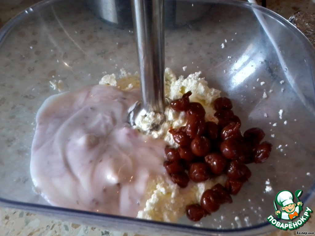 Теперь добавить 200 г йогурта и 2-3 ст.л. вишни. Все хорошо перемешать, в конце добавить распущенный желатин и еще раз размешать. Подглядела на сайте say7.