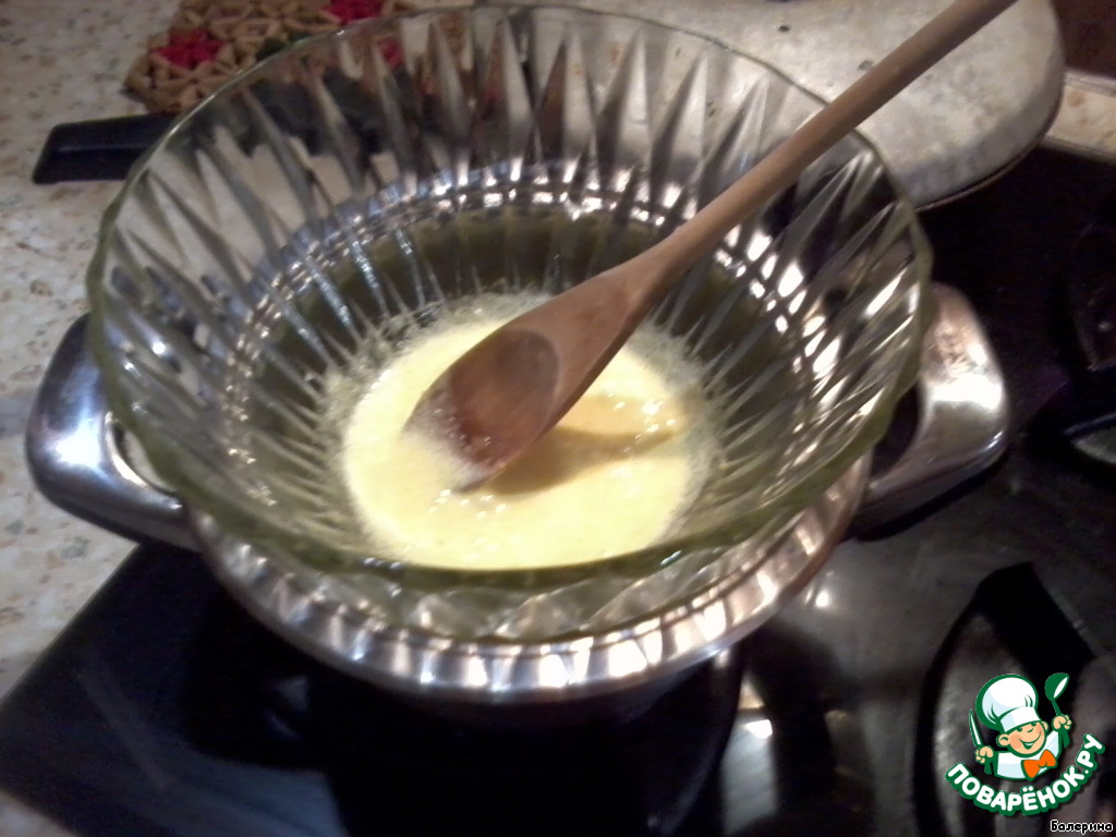 Теперь на водяной бане растираем 1 желток и 2 ст.л. сахара. Мешать до растворения сахара и загустения.