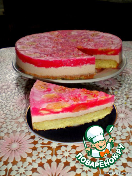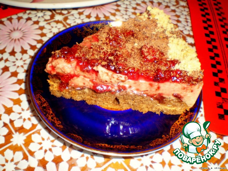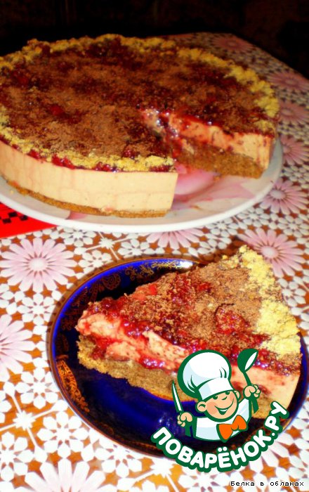 Желейную прослойку можно и не делать,на втором фото другой вариант этого торта - я просто выложила на суфле малиновое варенье,посыпала все тертым шоколадом.