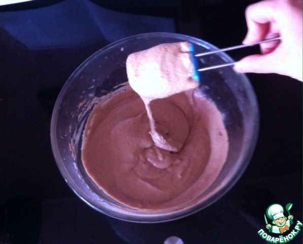 Готовим помадку. Растопим шоколад со сливочным маслом на водяной бане и венчиком вмешаем в варенку. В оригинальном рецепте используется концентрированное молоко и варится с сахаром. Я его не нашла и заменила старой доброй варенкой. Убираем в холодильник.