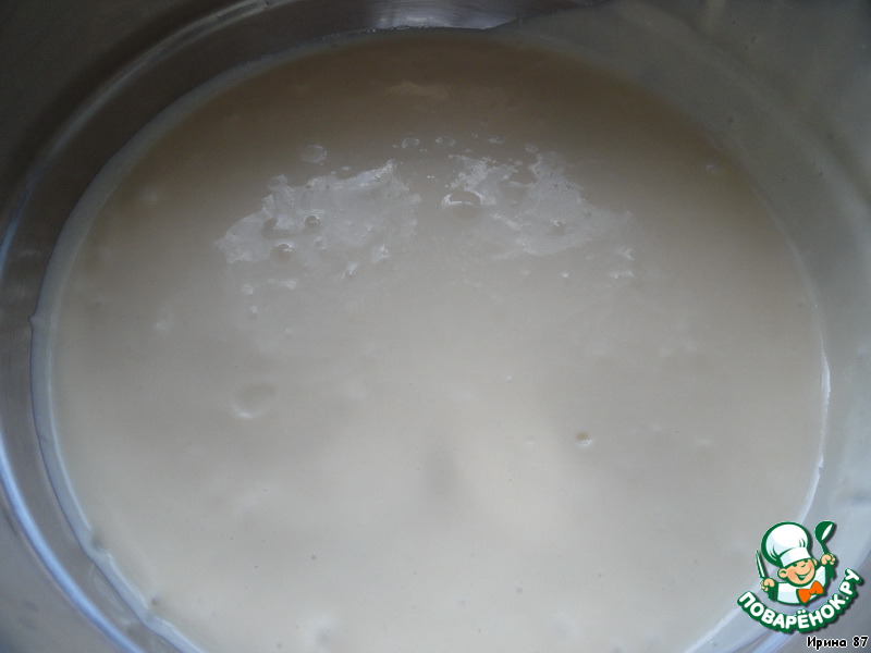 Сгущенку (200г) взбить со сметаной, добавить яйца и взбить до однородной массы. Погасить соду и всыпать муку. Тесто должно получится, как густая сметана.