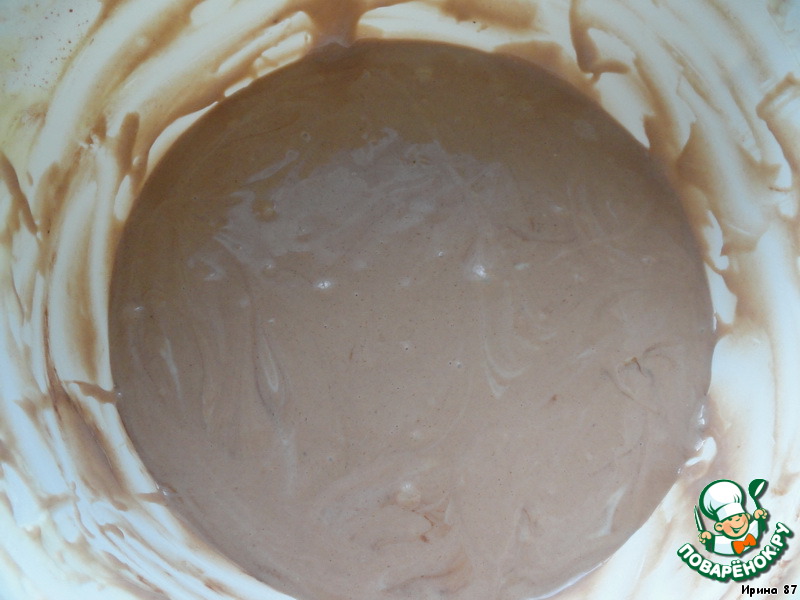 Потом тесто делим на две части, в одну часть добавляем какао и перемешиваем. Разливаем в разные формочки и выпекаем при 180°С.