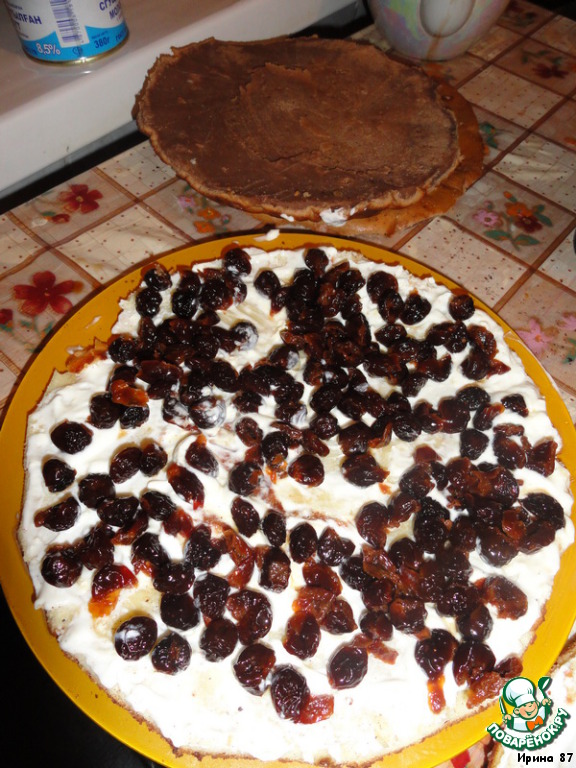 Готовым коржам дать остыть и разрезать их вдоль. Начинку можно класть, а можно и не класть, по Вашему желанию. Я же положила вишню из варенья промытую.