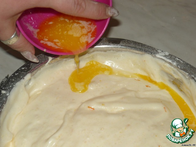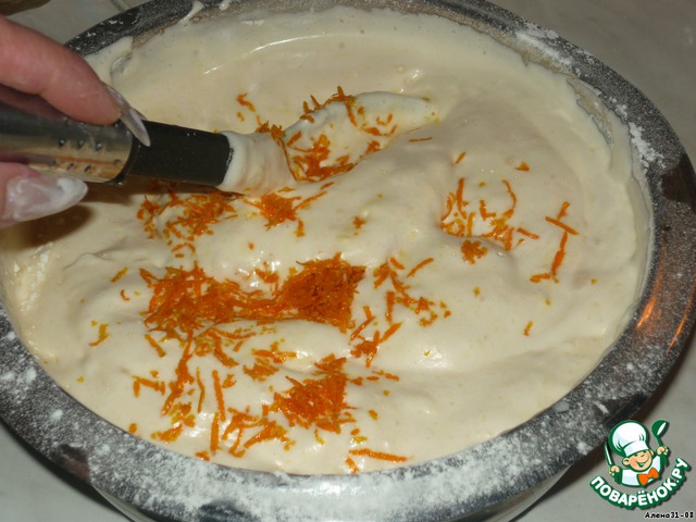 Вмешиваем цедру и аккуратненько, по краю чашки, вливаем масло, просеиваем муку (1 стак.) с разрыхлителем и осторожно вымешиваем тесто.