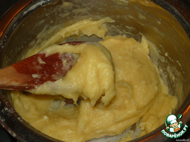 Пока печется бисквит, готовим заварное тесто. Вскипятим воду с 50г масла и цедрой 1 апельсина, засыпаем муку (0.5 стак), быстро перемешаем и снимем с огня. Затем вмешиваем 1 яйцо. Тесто должно быть густым