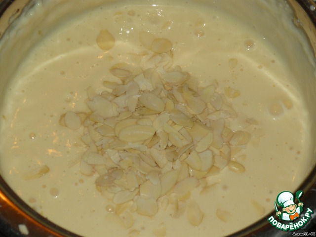 Затем миндаль. Кстати этот крем можно сделать проще: взбить 0.5л сливок 35% и добавить сыр, сахар(5ст.л) и орехи.