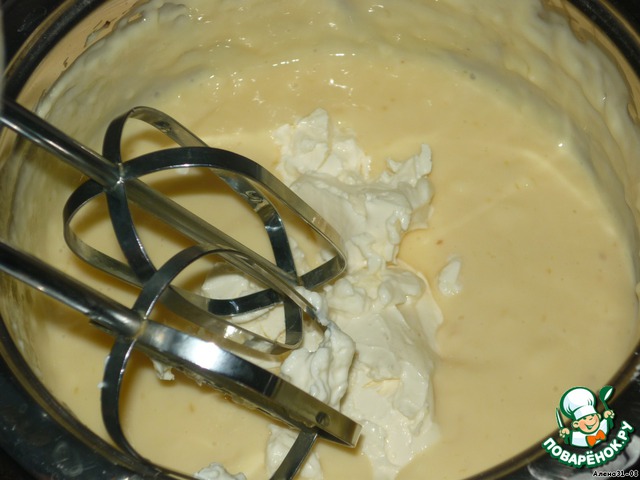Пока все печется, делаем крем. 400 мл молока вскипятить с 3 ст.л сахара, пудинг смешать со 100мл холодного молока и влить в кипящее. Варить 2 мин. Остудить и вмешать сыр.