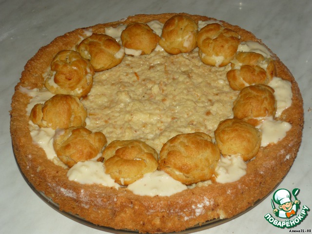 Выкладываем кольцом на корж. Остатки крема выкладываем по внешнему кольцу. И ставим в холодильник.