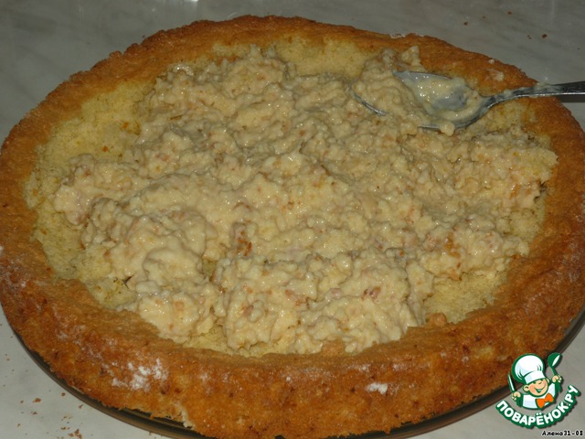 Из остывшего бисквита вынуть середину, оставив 3см бортик. Смешать тесто с 1/2 крема и заполнить бисквитный корж.