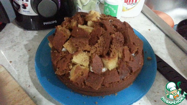 Далее выкладываем нашу верхушку, я ее тоже порезала на кубики, но можно было оставить целой