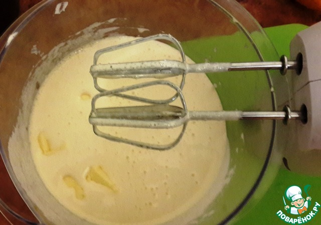 В отдельной посуде взбиваем яйца и сахар до белой пены. добавляем 150г сливочного масла и снова взбиваем. оставляем в сторонку.